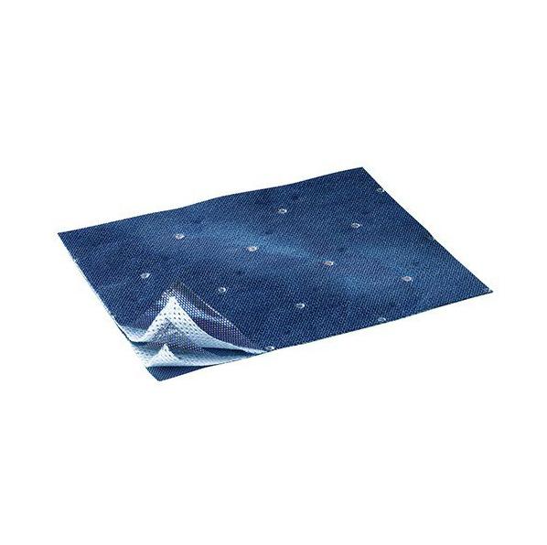 • Compuesto por 3 capas unidas por puntos de soldadura ultrasónica: una capa interior absorbente de rayón poliéster y dos capas externas de polietileno de alta densidad cubiertas con plata.